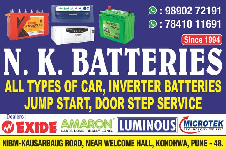 At N.K. Batteries shop in Kondhwa & Kasba Peth Pune , we provide top-quality batteries and inverters, ensuring you have the power solutions you need for a confident life. N.K. Batteries shop in Kondhwa & Kasba Peth Pune is Pune's No. 1 online multi-brand battery store, offering 100% genuine batteries along with original manufacturer warranty. N.K. Batteries shop in Kondhwa & Kasba Peth Pune provides car battery, bike battery, inverter battery, ups battery, home inverters and home ups. N.K. Batteries shop in Kondhwa & Kasba Peth Pune also provides regular maintenance services such as Battery Health Check up services to keep the battery life longer and prevent sudden failures.